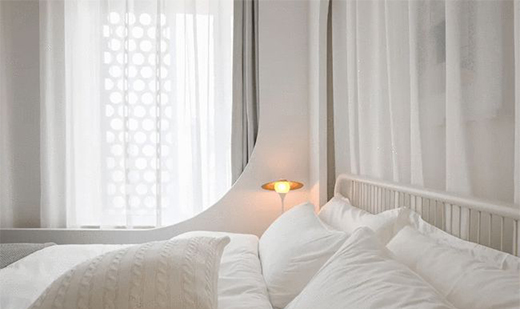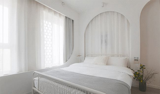 ▲ 臥室延續整體空間格調,床頭背景做拱形處理,白色紗簾后的掛畫具有朦朧美