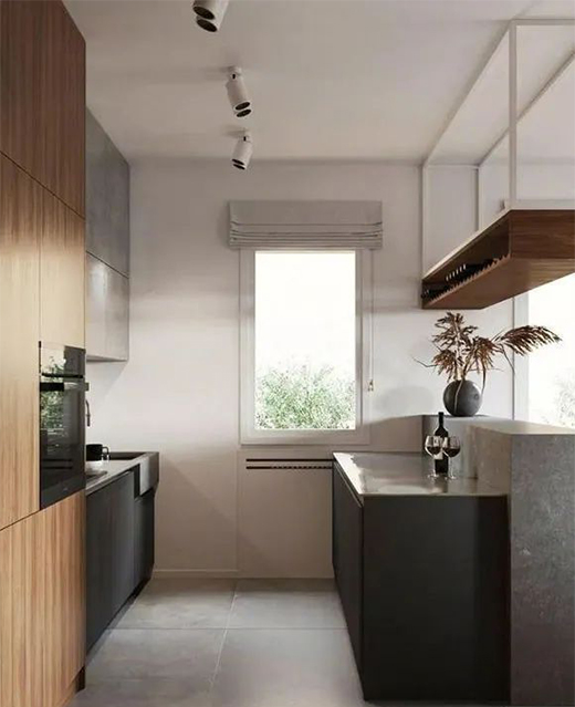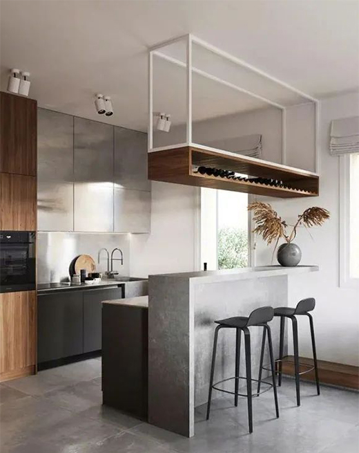 廚房的位置面積很小,定制的不銹鋼櫥柜結(jié)實耐用。靠吧臺的一側(cè)定制了工作臺,完全能夠滿足日常的餐飲需求。吧臺上方的小酒柜設(shè)計格外新穎,懸掛式安裝不占地方,更提升了空間的裝修檔次。