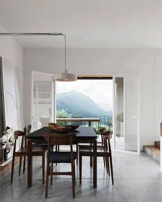 沒有吊頂?shù)牟蛷d空間,一套實木餐桌餐椅,再掛上一盞造型普通的小吊燈,簡簡單單卻更接地氣??粗T外漂亮的美景,相信用餐時的心情和味口都會好上許多吧。城市里住久了,真的是有些厭煩,每天都面對著高樓大廈,有種讓人透不過氣來的感覺。