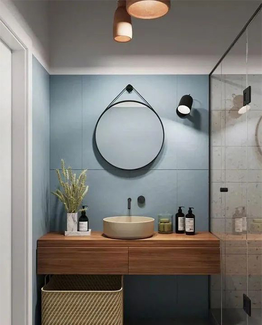 衛(wèi)生間的裝修效果,將浴室柜外移后,對衛(wèi)生間進行了簡單的干濕分離處理,掛墻式馬桶讓衛(wèi)生間看起來更加的寬敞。藍灰色的墻面,防水乳膠漆的使用在國內(nèi)相對少見,但營造出的視覺效果還是蠻不錯的。