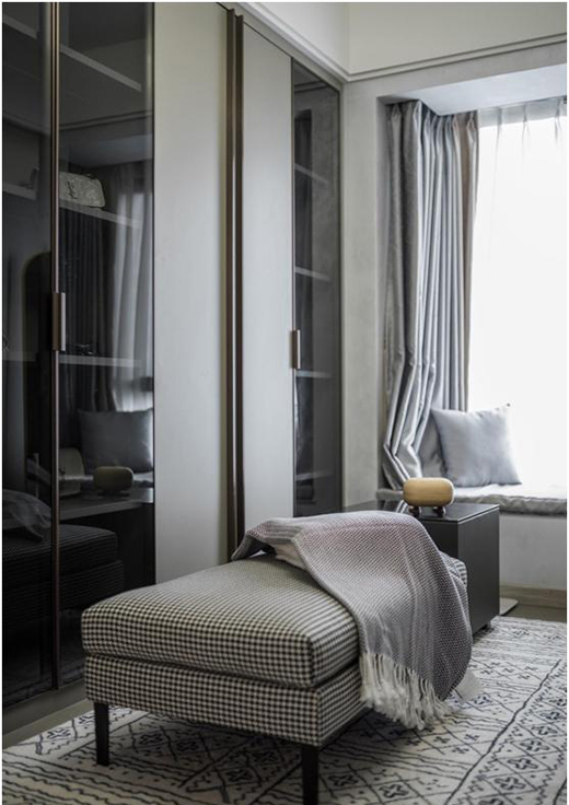衣帽間:和整屋色調相呼應,搭配外置通頂金屬拉手,突顯質感優雅~兩側墻通頂衣柜,充分利用空間虛實結合,整個空間敞亮,毫無擁擠感和壓抑感~配合開闊的飄窗設計,采光極佳,把整體空間的開闊感推向極致!