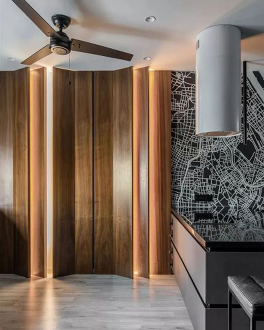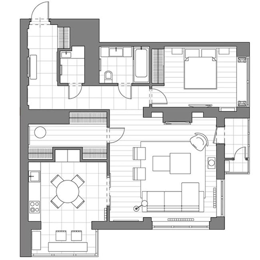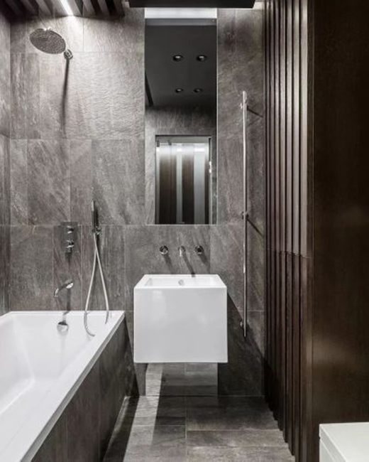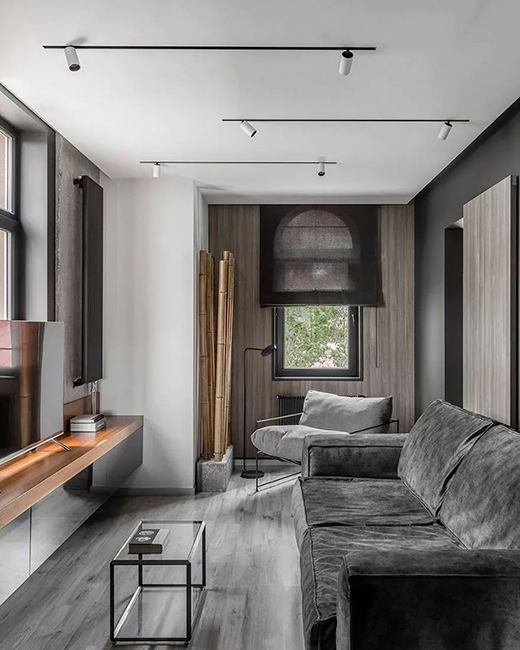 Quadrum工作室設計的63㎡單身公寓,客戶想要一個現代的內飾,陽剛和黑暗。它原本有一條狹長的走廊、孤立的房間、兩個小浴室和一個走廊。在重建過程中,建筑師將廚房與客廳結合在一起。由于公寓的特定形狀,開放空間被拉長了。以線性方式放置所有功能區域。