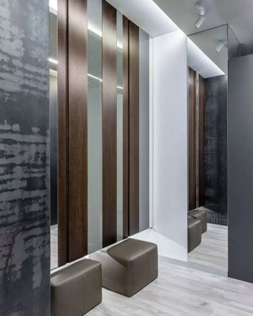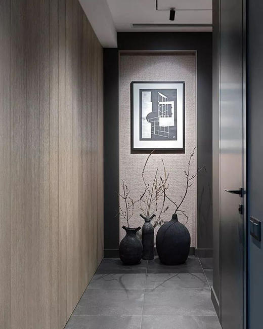業主想要一個帶有木制家具的單色黑白內飾,作為走廊和客廳的墻壁裝飾,還使用了帶有垂直關節的石膏板。裝飾中使用了不同質地和特性的材料-木材、瓷器、大理石、石膏、玻璃,所有這些都旨在營造一種環保感和室內意識。