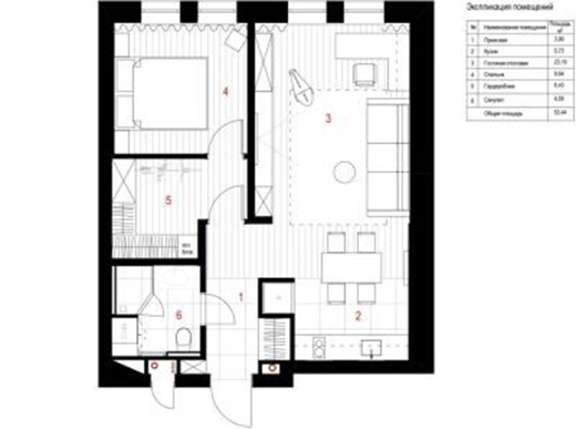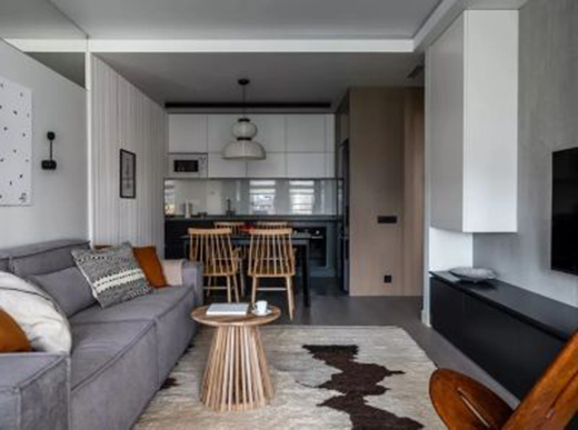 Alexandra Dashkevich和Natalya Kanchukova設計了一套面積為54㎡的公寓。擁有寬敞的廚房客廳、餐廳和靠窗的工作區、獨立臥室、帶運動器材存儲空間的大型更衣室、寬敞的外衣衣柜被放置在走廊上。