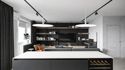 廚房位于客廳的后方,黑白色的臺式中島雙層設計,上方的白色吊燈又突出了整個空間的藝術氛圍,雅黑色的櫥柜在空間中進行相互融合,讓整個空間的層次氛圍越來越豐富。