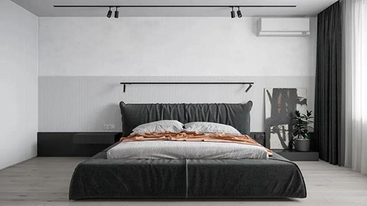 整個臥室依舊延續簡潔的設計風格,黑白灰搭配也是整個空間的主色調,低飽和度的橘色調讓整個空間變得更加活潑。