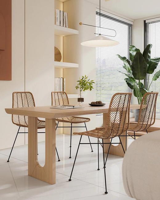 在用餐區(qū),四把流行的柳條椅圍繞著一張現(xiàn)代木制餐桌。一個大型室內(nèi)植物將室內(nèi)餐廳與窗外的綠色全景連接起來。在木制餐桌的頂部,一個小花瓶是一個簡單的餐桌中心。