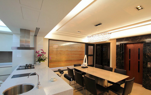 開放式的廚房,讓整個空間看起來更加開闊。木質的桌椅搭配木質的地板,協調感一涌而出。放置的小花,給就餐環境增添了一絲浪漫情調。