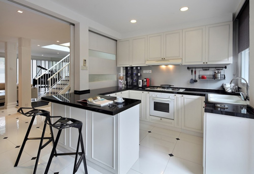 流暢的邊框線條,有著宮廷般的富麗氣質,象牙白與歐式櫥柜的結合,整體強調統一、大氣的生活環境,同時雪花圓弧大理石餐臺的設計,也給生活增添不少情趣。