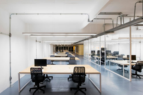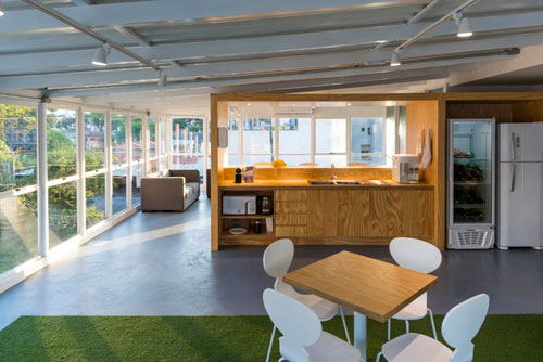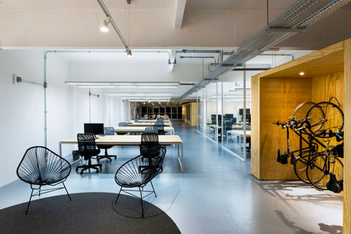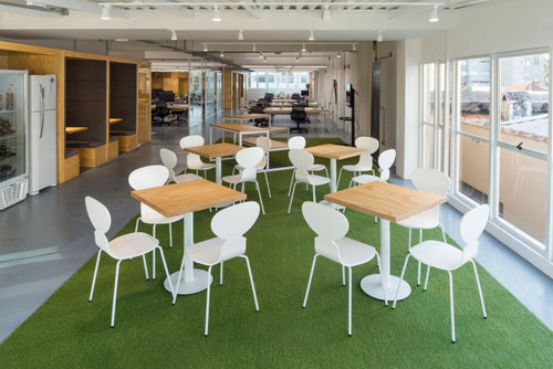 地板采用白色和灰色環氧涂料,以及白色的墻壁和天花板,裸露的電氣線路安裝方便,便于維護。設計師只使用了兩種類型的照明,一種大而明亮,適合工作環境;另一個光線更暖黃,適合生活環境。入口處既是第一個會議室,便于來訪咨詢,旁邊就是自行車架和員工的衣柜。第二個會議室位于“陽臺”的下方,還有一些小的會議桌以及餐飲設備。大地板上的人造草是最輕松的會議地點并且靠近窗戶,可以沐浴陽光。
