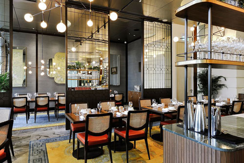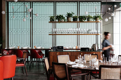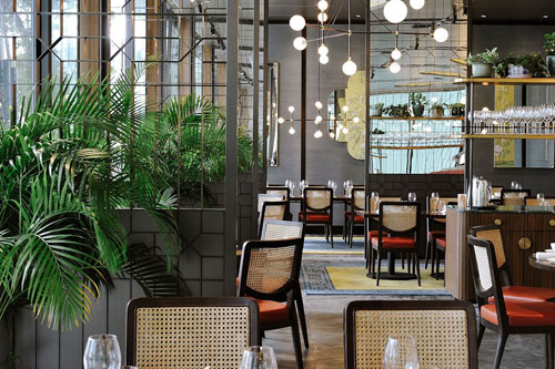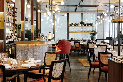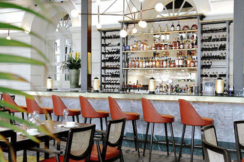 設計師考慮到餐廳特殊的地理位置:一側靠近新加坡河,一側靠近博物館,也因此設置了兩個入口。整個空間包括主用餐區,以及一個由黃色屏風隔開的靈活的私人包廂。兩個大型獨立的服務站將餐廳分成兩個部分,包括那個令人印象深刻的六米長的大理石酒吧。三個開放式貨架由帶有銅質裝飾的實木板條制成,架身是垂直拼接的木條,桌面是一塊淺灰色大理石,整體呈現出一種高貴而內斂的氣質。再往上看,一組特別定制設計的吊燈安靜懸掛在天花板上,投放著溫和的光。它由青銅色的金屬、銅和玻璃球組合而成,三三兩兩的組合錯落有致,以呼應充滿歷史感的拱形墻飾,而酒吧大理石桌面上的燈籠狀燈具則更添一份浪漫。