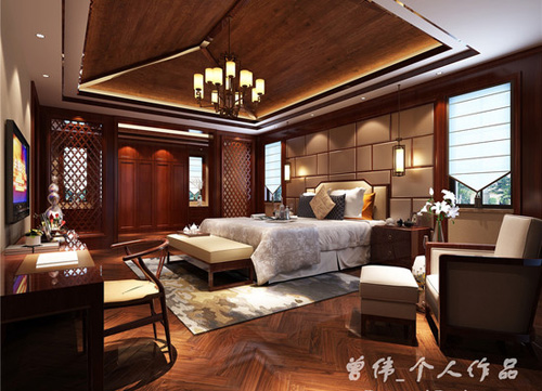 現代與傳統的搭配,使得臥室在優雅大氣中不失現代生活的氣質。一點綠色調和著原木色的統調,使得空間少了一點沉悶,多了一點清新。整個臥室以簡潔的線條彰顯著品質感。