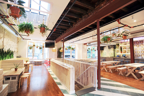 Mission Taqueria餐廳位于費城市中心的桑瑟姆街,狹窄的街道上有著城市生活的景象和聲音,它離墨西哥的藍色海水和溫暖的白色沙灘還很遠,但客戶卻想把那的旅行體驗融入他們的新餐廳設計中。餐廳的內(nèi)部表達了對墨西哥的光明、輕快、有趣和輕松的回憶。而這些記憶以自然的光線、郁郁蔥蔥的綠色植物、白色的洗過的漆面、色彩和圖案的流行以及定制的霓虹燈的形式呈現(xiàn)出來。