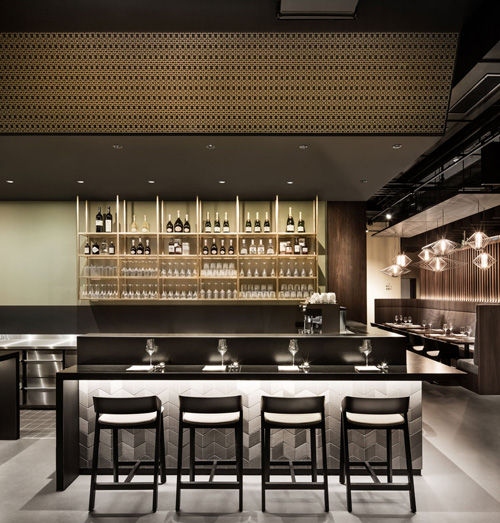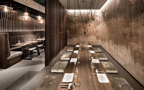 刻有餐廳標志的橡木前庭引導顧客進入餐廳,前庭后方的吊燈很吸引人,這是對亞洲燈籠的現代化詮釋。?靠近窗邊的小角落有著開放的視野,由裝飾著亞洲風格的裝飾框架分開,很受客人的歡迎。對面的用餐區設有一間酒吧和一個現場壽司柜臺,柜臺沿窗戶延伸。黑色隔音板從敞開的天花板上排成一排,黑色的天花板鑲邊突出了玻璃幕墻的斜坡,打開了空間。它也為從不同角度捕捉光線的金色裝飾創造了一個背景。