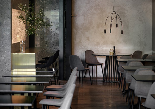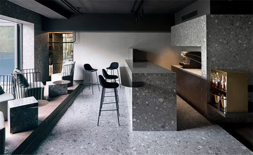 在這長條形的空間里,南側(cè)從酒店大廳起至北側(cè)面向一條河流打開。沿著長條形空間,設(shè)計(jì)團(tuán)隊(duì)設(shè)計(jì)了一系列不同的微環(huán)境-從公共的到私密的,借用自然光線介入空間的不同的姿態(tài)為使用者創(chuàng)設(shè)不同的空間氛圍。一個(gè)可完全開啟的大型折疊門意在吸引顧客走進(jìn)餐廳吧臺(tái)和餐區(qū)。特制的黃銅屏風(fēng)插在獨(dú)立的石頭吧臺(tái)上,成為空間中精致優(yōu)雅的視覺焦點(diǎn)。一些由黃銅制作的小元素節(jié)制地點(diǎn)綴在空間之中,豐富空間的同時(shí)并不打破原本優(yōu)雅的灰色調(diào)。吧臺(tái)區(qū)域?yàn)楦鞣N形式的社交活動(dòng)提供了足夠的可能性。