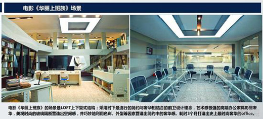 以《華麗上班族》作為案例分析,故事發(fā)生在當代都市,金色與藍色構成全片主色調,冷暖色的相互碰撞,高冷與溫馨氣質的完美融合,同時也給予視覺上強烈的反差。空間布景多利用條框隔出或用玻璃隔斷,例如頂部用白光點綴,底部黃色線條分割,不僅打破了單一色調的壓抑感,更有未來主義的空間感。辦公區(qū)、家居場景設計前衛(wèi),整體非常奢華、現(xiàn)代。
