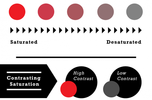色彩的強度最強的時候,也就是飽和度最高的時候,是最純粹的色彩。飽和度越高色彩越鮮艷,飽和度越低越接近于灰色。同一色彩不同飽和度下的色彩能夠構成對比,不同色彩不同飽和度下也能構成對比。