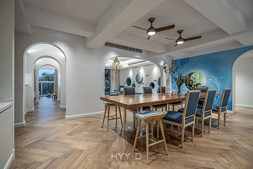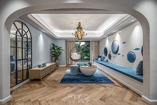 深圳卓越維港私宅設(shè)計(jì)剛好將鄭鴻這一理念完美演繹了出來(lái)。契合業(yè)主喜歡養(yǎng)魚的喜好,鴻藝源設(shè)計(jì)團(tuán)隊(duì)在設(shè)計(jì)中,專門選取了海洋與魚的元素,以藍(lán)色作為點(diǎn)綴豐富空間層次。客廳墻上大小不一的圓孔設(shè)計(jì),不僅能作為房屋的裝飾,還能作為收納圓墩的空間,加上時(shí)尚的竹制吊椅、多功能房的洞口設(shè)計(jì)等,極大地增加了房屋的互動(dòng)性,生活其中,就仿佛置身于海底世界一樣,完全打破了以往家只是“住宅”這一單一的功能,增加了寓教于樂(lè)的生活趣味。