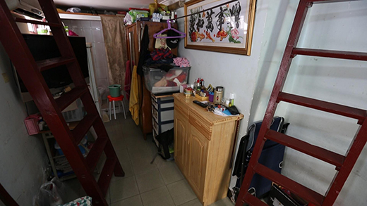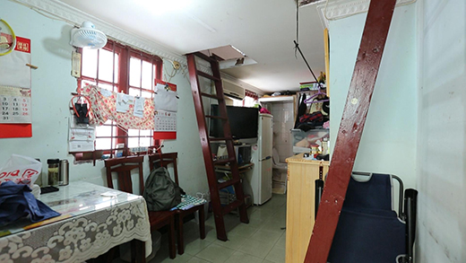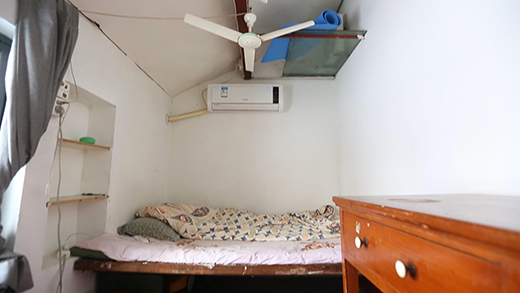 小黃父母的臥室在最低處的閣樓上,層高十分有限,最高的地方也只有1.5米,對于他們而言,在臥室里起身站立都是一種奢望。小黃的臥室雖然層高足夠,但是采光極差,白天都需要開燈。房間內幾乎沒有儲物空間,僅有一張嵌在墻上的單人床,身高178cm的他連睡覺都無法伸直。
