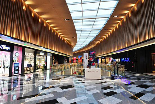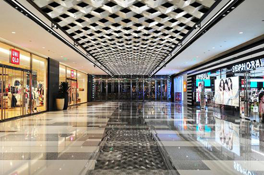 中空挑高空間縱深向對應的是透明的玻璃采光頂,引入自然光與內部燈光的互動。購物區域天花造型層疊有致,區別于明亮的商鋪室內燈光立意,點狀射燈將光源投射于天花的立體棋盤格造型之上,打造出了天花上光影交疊的靈動,不規則光影加重了幾何體塊交疊帶給人的視覺吸引,豐富層次的同時更添意趣。
