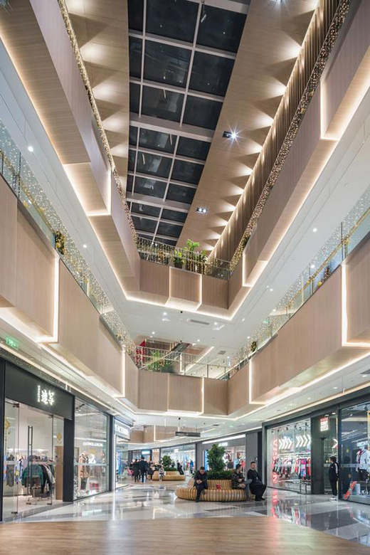 頂層購物區域的內裝大面積采用溫度質感的原木格柵,肌理豐富,層次鮮明,更在色調、材質上與地面形成強烈對比。燈光設計介入發生碰撞的二者之間,以點狀投光燈從格柵兩端洗面板,以水晶簾狀的璀璨串燈照耀內外,以樹形裝置的原木射燈訴說雅致,將商業空間的格調平衡在現代、時尚與質樸、溫馨之間。