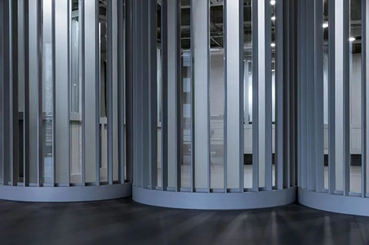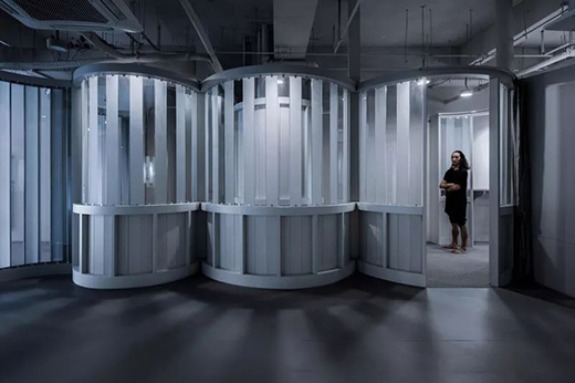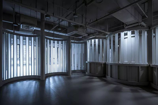 實(shí)際上,在舞蹈教學(xué)中,這種“觀賞”,自然地促進(jìn)了學(xué)員的學(xué)習(xí)動力與表演熱情。成為優(yōu)秀的“展示者”,表達(dá)自己,用身體積極主動地傳遞信息,這不正是舞蹈教學(xué)中非常重要的一部分么。身處“包間走廊”中的等待學(xué)習(xí)的學(xué)員,也在學(xué)習(xí)成為優(yōu)秀的“觀賞者”。正是這種表演與觀看的往來,促成了教學(xué)中生動的模擬,讓這個過程變得生動、有趣。由此,環(huán)境中的“形象符號”也變得更有提示性的作用:整個裝置立面中全部采用了豎向的線條,讓人聯(lián)想到古典劇院中褶皺的幕布。