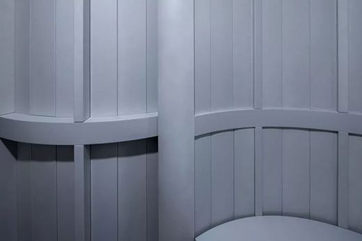 “器屋/ Vase House”是一個舞蹈教室,我們希望這里是教學(xué)、練習(xí)舞蹈的地方,也是每個人通過身體使用、體驗(yàn)、參與其中的室內(nèi)“構(gòu)筑物”。這里鼓勵人們通過身體體驗(yàn),所以它被設(shè)計的非常的柔軟,它面積不大,圓形始終貫徹在整體設(shè)計的邏輯中,并通過這個基礎(chǔ)形狀的組合,自然而然地衍生出不同功能的房間,如門廳、更衣室、練習(xí)室、教室、走廊等等。為了不浪費(fèi)面積,走廊與休息間合并互相兼顧使用,它還有一個更為重要的功能,即模仿古典劇院中的貴賓包房,有座椅,有矮扶墻,有看窗。多個半圓形在平面上串聯(lián)而成的包間式走廊,便于“看客”坐在其中休息、等待、同時觀看舞蹈室里面的“表演”。