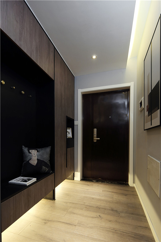 設計師希望業主從進門起就感受到空間的溫馨與安寧,洗去浮華,專注生活,仿佛進入與世隔絕的港灣。別致的玄關和墻上的裝飾畫共同演繹出戲劇十足的藝術空間,多功能儲物柜子既遮擋了墻體畸形部位,又滿足了業主進出家門的生活需要。