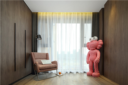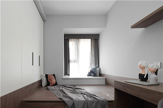 兼具衣帽間、儲物間、書房、臥室多功能空間,全屋嵌入式衣柜,有格調的飄窗,透著詩意,給業主一家人提供了一個機動靈活的私密空間和海量的儲物空間。