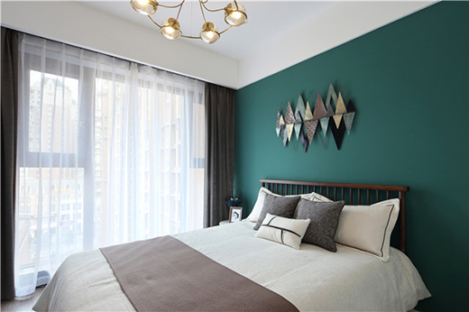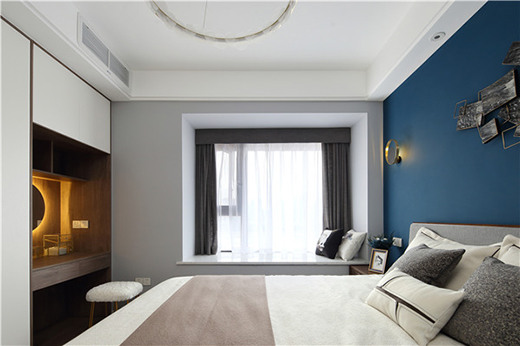 主臥以灰白搭配藍綠色系的主色調,灰色的內斂低調,白色的清新明快,墨綠色的沉穩理性,融合出一種平衡的和諧之美。主臥四組燈光設計,滿足了業主看書時、梳妝時、更衣時、入睡時等不同時間對燈光的需求。