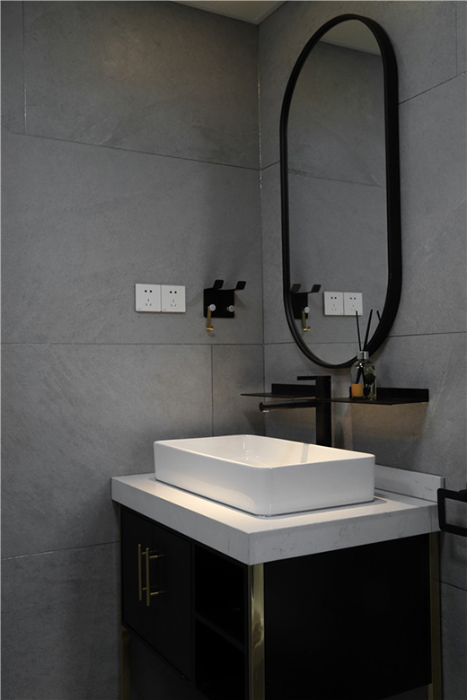 以灰色做為衛生間的主色調,不但顯得清爽,也有一種舒適的優雅品味。衛生間的設計細節到位,吊頂完美掩飾了建筑結構的缺陷;次衛空間規劃彌補了原本的畸形結構,與此同時設計師巧妙的利用畸形部位做了壁龕置物。