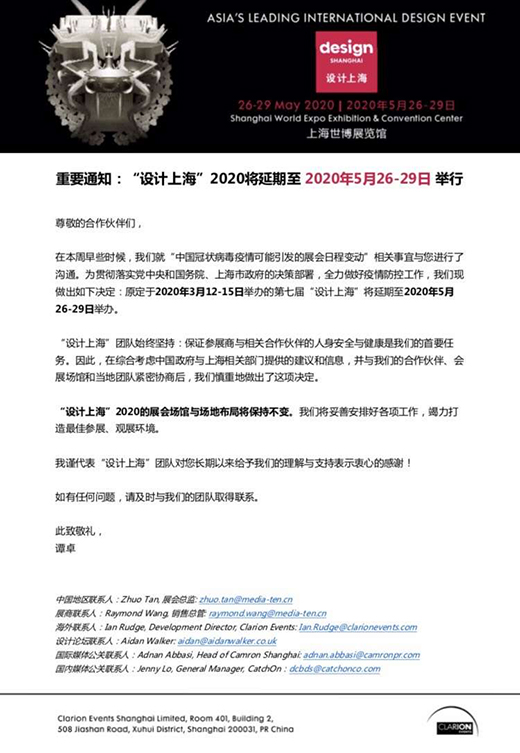 2020設計上海主辦方發布公告,原定于2020年3月12-15日舉辦的第七屆“設計上海”展會,將延期至2020年5月26-29日舉辦。