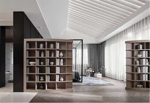 書房作為主人私密空間,意在靜、雅、舒適。書桌采用三面圍合造型,兩側鏤空以線條展現輕盈優雅,與天花及墻面應和。