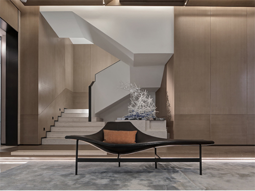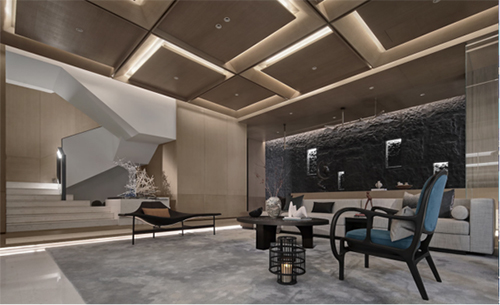 室內公區天花吊頂造型簡潔且呈立體陣列感,無中式符號,卻顯出東方的莊重大氣,天花與墻面在色調上的呼應統一,強化了空間在視覺上的延伸感。家具呈現結構線條感,皮革材質予人舒適與質感;地毯選用加絲面料,更注重親膚觸感。