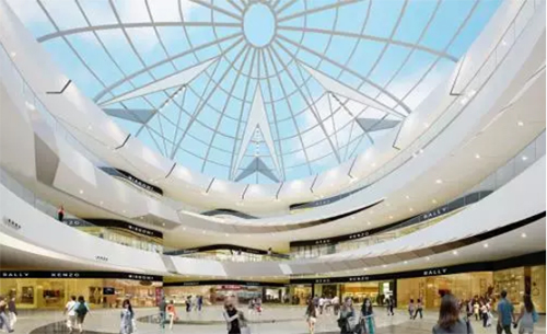 在中庭設(shè)良好的屋頂采光,具有將購物者的視線引導(dǎo)向上的效果,對于吸引購物者上樓選逛有良好的推動力。在此既是商品展示的舞臺又是公共活動及休息的場所。中庭挑空直達屋頂,人們在中庭留步,各樓層扶梯聯(lián)系動線一覽無余,增加了店鋪可見性,很好地體現(xiàn)了動線交匯點的特征。