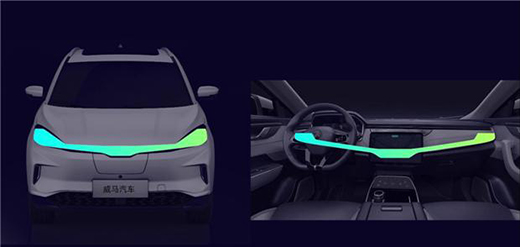 與傳統燃油車相比,新能源汽車沒有了發動機的空間負擔,在車內空間重構、整車電動化等方面為設計師提供了更多想象的可能。如何讓用戶從設計上,快速識別一輛智能電動汽車,成為各車企思考的課題。威馬汽車獨創智能交互動態Logo燈,由五條柱狀“極光色”LED燈組成,富有節奏的跳動兼具呼吸效果和流水特征,不僅在行車間成為其智能電動汽車身份的象征,更兼具實用性,為用戶帶來車輛充電、解鎖、上鎖等 7種行車模式的智能提示。