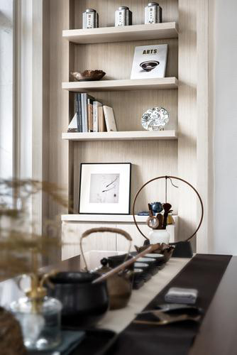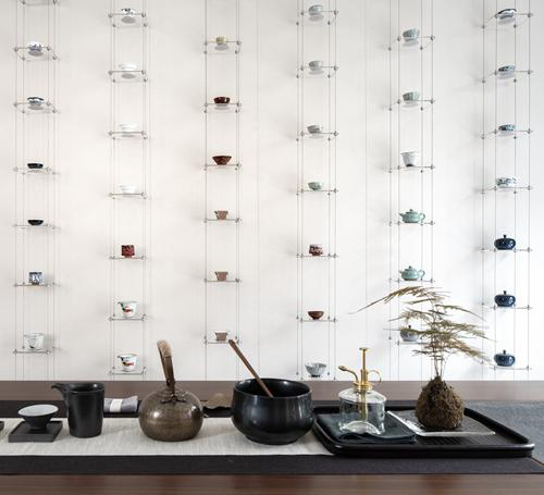 怡然自得的空間氛圍中,散逸著濃郁的人文氣息。設計師將幾十枚形制不一的杯盞陳列于一整面背景墻,精美的茶盞由此凸顯出獨到的藝術韻味,無用之美,在靜寂中流淌。