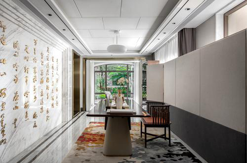 明亮的自然光照、古雅別致的圈椅、富有表現(xiàn)力的墻面鏤刻書法字,設計師在書法室這一隅空間中體現(xiàn)了許多不同尋常的室內(nèi)細節(jié),且讓每個元素和諧地兼容在一起。