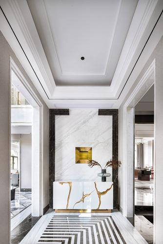 本案空間設計,SEPD團隊一反常規(guī)思路,打破空間藝術的風格定義,旨在突出空間的共生美學和海納百川的多元魅力。古典優(yōu)雅、都市色彩、當代禪意、高級質(zhì)感以及中西交融的藝術張力,共同宣揚著當代墅居生活的豐瞻與圓融大雅。