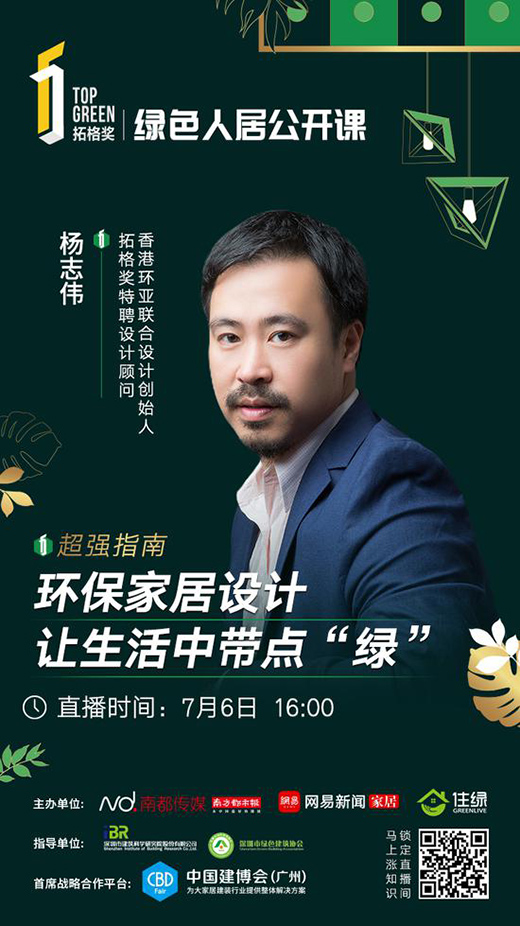 7月6日,綠色人居公開課第五期,香港環亞聯合設計創始人、拓格獎特聘設計顧問楊志偉帶來《環保家居設計讓生活中帶點“綠”》課程分享,向大家講解綠色家居設計的原則與方法。