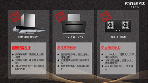 在家裝節的最后,方太武漢培訓部夏秀芳向與會人員展示了方太“黑科技”——分別運用了蝶翼環吸科技和懸浮環吸科技的兩種不同型號的新款油煙機。蝶翼環吸科技,能夠實現控煙區外擴,油煙再大也罩得住;控煙區下置,逼近黃金控煙區;強大的整流能力,輕松濾油、呵護內腔;而運用了懸浮環吸科技后,能夠實現四周多維凈煙,高效攏吸,速吸速排;全黑易清潔內腔,油污不打擾;易拆卸導煙板,拒絕藏污納垢。還有運用了勁火精控技術的燃氣灶,4200W大火,精控火力升級,爆炒更美味;內環穩焰設計,穩定小火,煲湯更營養;安全傘+雙針點火,經久耐用。
