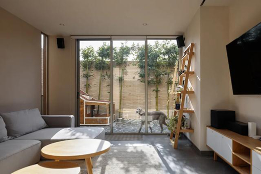 底層的房間遵循了“內省性空間”的排列邏輯,目的是創造一個靈活開放的室內氣氛。裝飾材料選用瓷磚地面,木制隔板和裸露磚墻。設計師在住宅前部設置了開放式廚房和就餐區,大面積的滑動玻璃門將室內和室外庭院連接起來,使室內外空間界限模糊。院子采用石制鋪地,墻壁上點綴著郁郁蔥蔥的盆栽觀賞植物,增加了自然空間的氣氛。