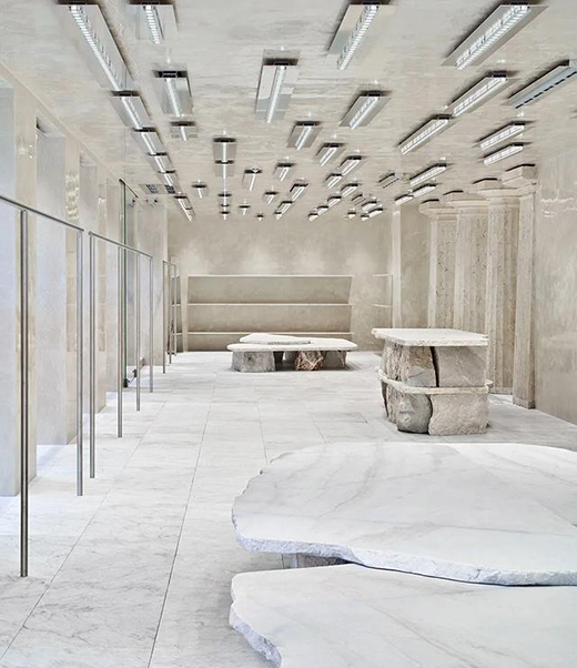 通過柱子連接的三個房間與主軸盡端抽象柱廊構成了新的空間背景。假柱廊用真正的大理石做成,形成了一個通向試衣間的入口。Max Lamb所做的大理石家具在舊地面上創造了一個新的大理石地板層,以形成一個展臺。由Benoit Lalloz設計的燈具銳利而富有科技感,與大理石材質相協調,使空間感達到平衡統一。