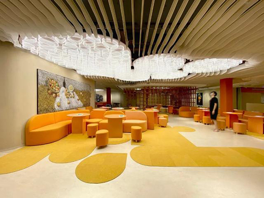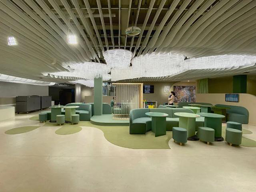 第二層是教學和活動的主要區域,中間的開放空間是一個可供兒童自由活動的庭院。二層中央公共空間的燈光設計以樹木為靈感,給室內空間帶來自然氣息。三處吊頂燈營造靜謐的灰白空間,以半透明亞克力為材料,通過層疊組合,打造出有機的弧形造型,自然營造空間的視線焦點。