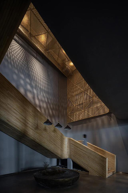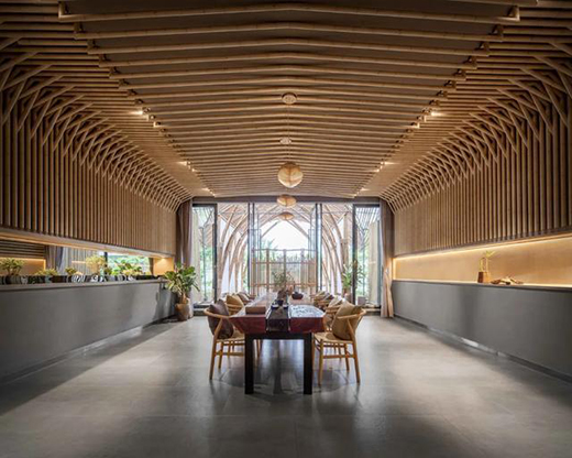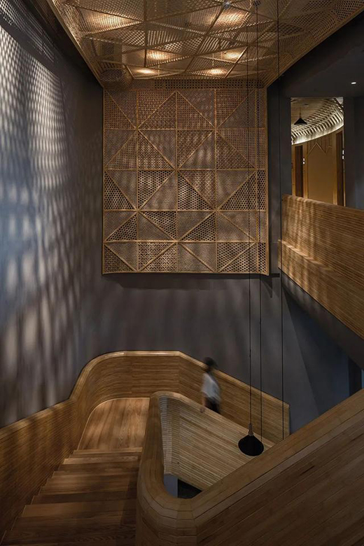 設計以竹子不同的肌理紋理來表現空間。房間內用竹片、竹片、竹皮三種不同的材質構成了拱形的竹編,形成了每個空間獨特的表皮。同時,以原竹構筑過道頂面,追求一種時空“錯亂”。大廳樓梯間以竹編造型,燈光將光線投射到墻壁上,營造一種宛如竹海中破碎陽光的景象。