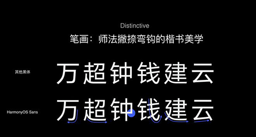 在筆畫上,華為認(rèn)為師法撇捺彎鉤的楷書美感,比較明顯的是長的曲線、弧線的筆畫,進(jìn)行了曲線優(yōu)美的調(diào)整,從基本的筆畫里面提取這些進(jìn)行改造。