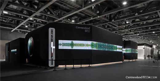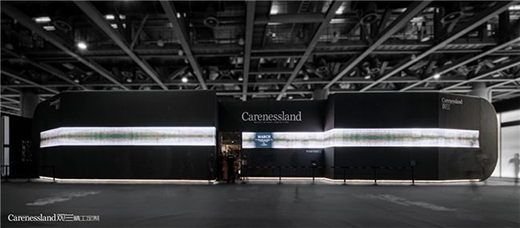 此次的展館也由三大團隊聯合打造。展館總面積700余平,詮釋觀蘭對當代都市人居生活的探索。整體設計概念來源于Carenessland首字母“C”,從展館外立面到微小的產品把手細節,“C” 元素貫穿始終。剝離形式感,呈現純粹的空間精神,力求與觀者在精神世界中產生共鳴與碰撞。展館外立面融入了當代藝術家馬峻兩個前沿概念性影像作品,32米寬1米高的LED顯示屏,頗具視覺震撼力。