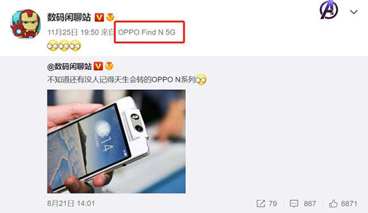 近日根據@數碼閑聊站微博小尾巴顯示,看來綠廠N系將會回歸,新機將歸屬于Find系列之中,不知道會不會延續翻轉鏡頭的設計。