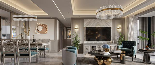 餐廳灰白的色調加上輕奢風格的水晶吊燈,光影滲透每一寸空間,使空間的格調感氛圍感更加強烈。