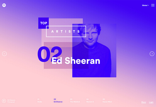 雙色調配色已經存在很長的一段時間了,單我們幾天所說的雙色調方案是在全屏設計背景下,加入漸變效果和高沖擊力視覺設計下的雙色調配色方案。在扁平化的大勢之下,Spotify 大范圍使用雙色調配色,將這一設計手法推到了潮頭。